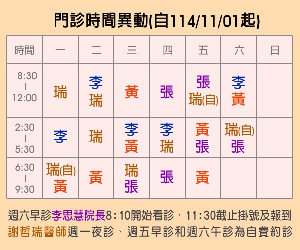 看診時間:週一〜週日,國定假日看診請參考